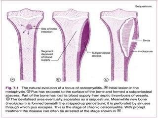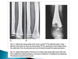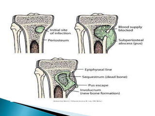 Osteomyelitis is an infection of bone that can occur through the bloodstream or direct inoculation. It is caused by bacteria like Staphylococcus aureus and affects bones differently based on a patient's age. In children, it commonly impacts the long bones of the legs and arms, while in adults it is more likely to involve the vertebrae. Diagnosis involves clinical signs, lab tests, and imaging studies. Treatment consists of antibiotics, rest, and sometimes surgery to drain abscesses.