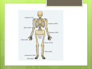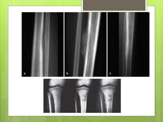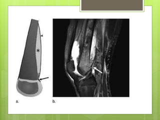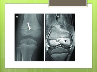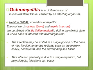 This document discusses acute osteomyelitis, beginning with a definition and classification. It describes how the infection can spread from the initial site in bone to surrounding tissues. Common causative organisms are discussed for both children and adults. Clinical features vary depending on the patient's age but may include pain, fever, and localized swelling. Diagnostic imaging tools like x-ray, MRI, and bone scans are described. Treatment involves aspirating pus for culture and treating with antibiotics.