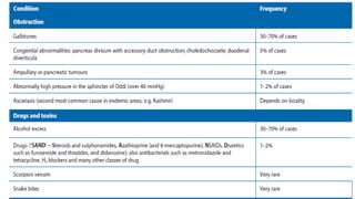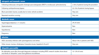 1. Acute pancreatitis is inflammation of the pancreas that presents with abdominal pain and elevated pancreatic enzymes. Common causes include gallstones, alcohol use, and idiopathic factors.