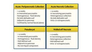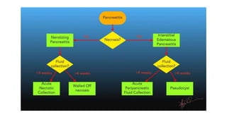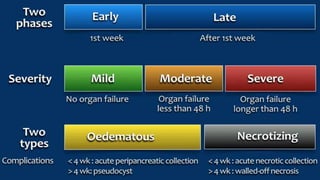 This document provides an overview of acute pancreatitis including its anatomy, physiology, causes, presentation, diagnosis, severity assessment, management, and complications. Some key points: