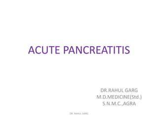 1) Acute pancreatitis is defined as an acute inflammatory process of the pancreas with variable involvement of other tissues. It is diagnosed when a patient presents with abdominal pain consistent with the disease as well as serum amylase or lipase levels over three times the upper limit of normal.