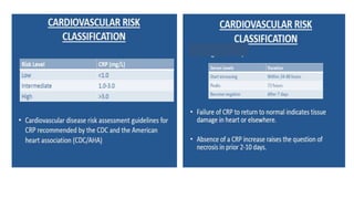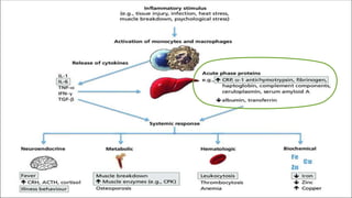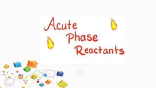 The document discusses acute phase proteins (APPs), which are proteins whose plasma concentrations increase or decrease in response to inflammation. It defines positive and negative APPs, provides examples of major, moderate, and minor APPs for different species, and describes the functions of key APPs like C-reactive protein (CRP), serum amyloid A, haptoglobin, ceruloplasmin, and alpha-1-acid glycoprotein. It also discusses methods for measuring APPs, including immunoassays, electrophoresis, and clinical importance of APPs like CRP.