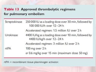 This document discusses acute pulmonary embolism (PE), which results from blood clots (deep vein thromboses or DVTs) breaking off and traveling to the lungs. PE is a leading cause of preventable hospital death. The document covers risk factors for PE like immobility, surgery, cancer, and inherited conditions. It also discusses methods for diagnosing PE like the Wells criteria, D-dimer testing, chest imaging like CT scans, and treatment including anticoagulation and thrombolysis for hemodynamically unstable patients. Poor prognostic signs of PE include hypotension, cardiac biomarkers indicating injury, and imaging findings of right ventricular dysfunction. Prevention through appropriate DVT prophylaxis is emphasized.