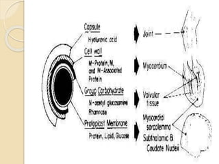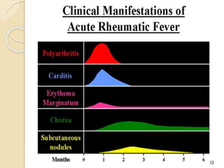 This document provides information on acute rheumatic fever. It defines rheumatic fever as an autoimmune condition that can occur weeks after a streptococcal throat infection. It affects children aged 5-15 and can cause arthritis, carditis, chorea, erythema marginatum, and subcutaneous nodules. Carditis is the most serious manifestation, often resulting in long term rheumatic heart disease. The document reviews the epidemiology, etiology, pathogenesis, clinical manifestations, diagnosis according to the revised Jones criteria, and long term sequelae including rheumatic heart disease.