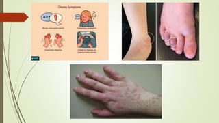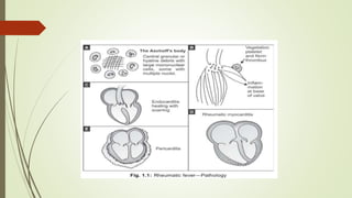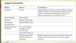 Acute rheumatic fever is an autoimmune disease triggered by specific strains of group A streptococcus, occurring approximately three weeks after pharyngitis. The condition primarily affects the heart, joints, and nervous system, leading to inflammation and various systemic manifestations such as carditis, arthritis, and chorea. Diagnosis is mainly clinical, based on the revised Jones criteria, with management including bed rest and anti-inflammatory medications, alongside primary and secondary prevention strategies to avoid recurrent infections.