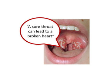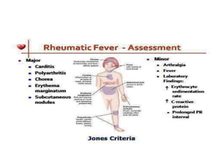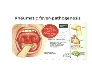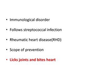 Rheumatic Fever is an immunological disorder that follows streptococcal infection and can lead to rheumatic heart disease. It most commonly affects children between 5-15 years of age and is more prevalent in populations with poor socioeconomic status. The pathogenesis involves molecular mimicry between streptococcal antigens and heart tissues, resulting in autoimmune damage to the heart valves. Clinical features include carditis, polyarthritis, chorea, and subcutaneous nodules. Treatment involves bed rest, antibiotics, aspirin, and steroids. Primary prevention focuses on early treatment of streptococcal infections, while secondary prophylaxis uses long-term benzathine penicillin injections.