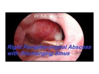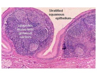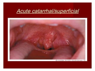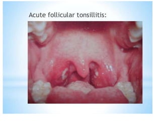 This document discusses acute tonsillitis, including the histology and classification of tonsils, the different types of acute tonsillitis, their symptoms, signs, etiology, treatment and potential complications. The main types discussed are acute catarrhal/superficial tonsillitis, acute membranous tonsillitis, acute follicular tonsillitis and acute parenchymatous tonsillitis. The etiology is primarily bacterial or viral infection, with common bacteria being Hemolytic Streptococcus, Staphylococcus and Pneumococcus. Symptoms include sore throat, difficulty swallowing, fever and constitutional symptoms like headache and malaise. Treatment involves rest, fluids, analgesics and antibiotics like penicillin for 7-