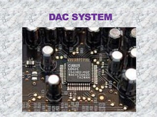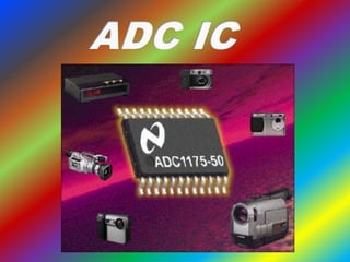 An analog-to-digital converter (ADC) converts an analog signal into a digital signal. It allows analog signals from the physical world to be processed digitally. Common types of ADCs include dual slope, successive approximation, flash, and delta-sigma converters. Digital-to-analog converters (DACs) perform the opposite conversion, taking a digital signal and outputting an analog voltage or current. Examples of DAC usage include audio signal generation and electric motor speed control. The document discusses improving the performance of high-speed, high-resolution ADCs and DACs through open-loop circuitry and time-interleaving techniques.