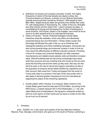 Guess Inc. is launching a new cosmetics line, 'Guess Who's Hot?', aiming to create brand awareness and reinforce its identity through an advertising campaign that emphasizes consumer demand and brand loyalty. The campaign will focus on affordability, quality, and a glamorous image, targeting select markets in the U.S., Canada, and Asia while leveraging celebrity endorsements to attract attention. The cosmetics line is positioned for growth during its introductory phase, promoting a comprehensive shopping experience for consumers seeking high-end products.