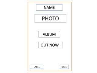 The document appears to be about a new album released by an artist, including their name, a photo, the album title, that it is now available, and the release date and record label. Details are repeated across three sections that include variations in order of the information provided.