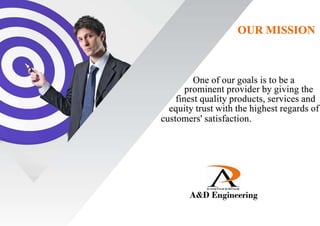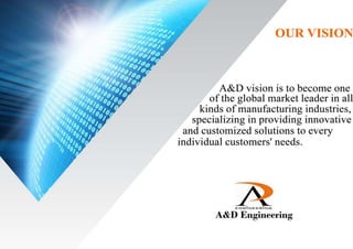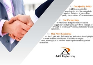 A&D Engineering is a one-stop solution provider for manufacturing industries that offers competitive solutions and provides customers with lower pricing through sourcing materials from overseas. It was established in 2008 and provides high quality, low cost products through its manufacturing facilities in Singapore and Malaysia, which include CNC and conventional machines. The company produces a wide range of standard and custom parts from micro pins to nozzles.