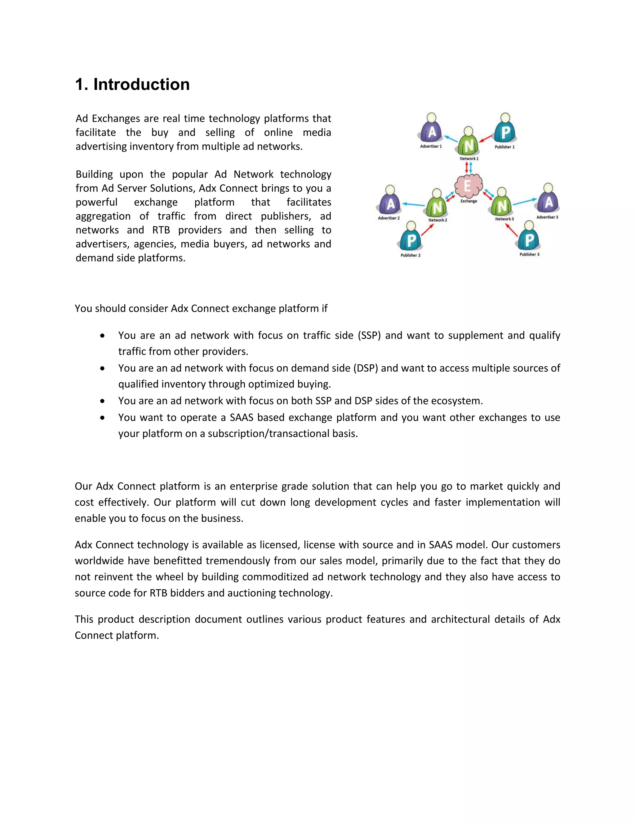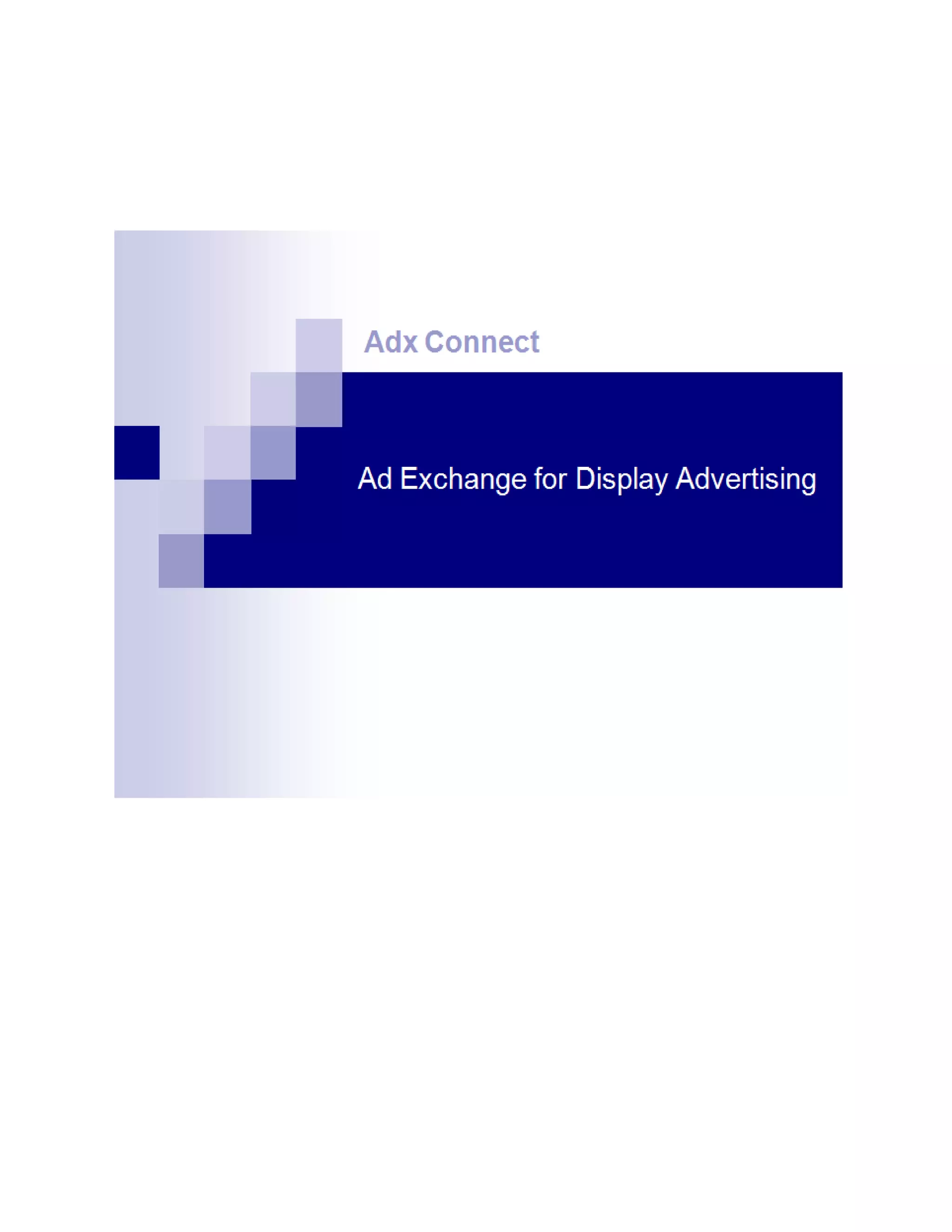 The document provides an overview of the Adx Connect real-time advertising exchange platform. It describes key features on the supply side, including direct publishers, ad networks, and real-time bidding (RTB) providers. It also covers demand-side features like direct advertisers, agencies, ad networks, and demand-side platforms. The platform incorporates an administrator interface, an engine to power transactions, and components for ad serving, bidding, auctioning, caching, monitoring, reporting, and optimization. It also outlines tools for external monitoring, application monitoring, archiving, and scalable deployment architectures.