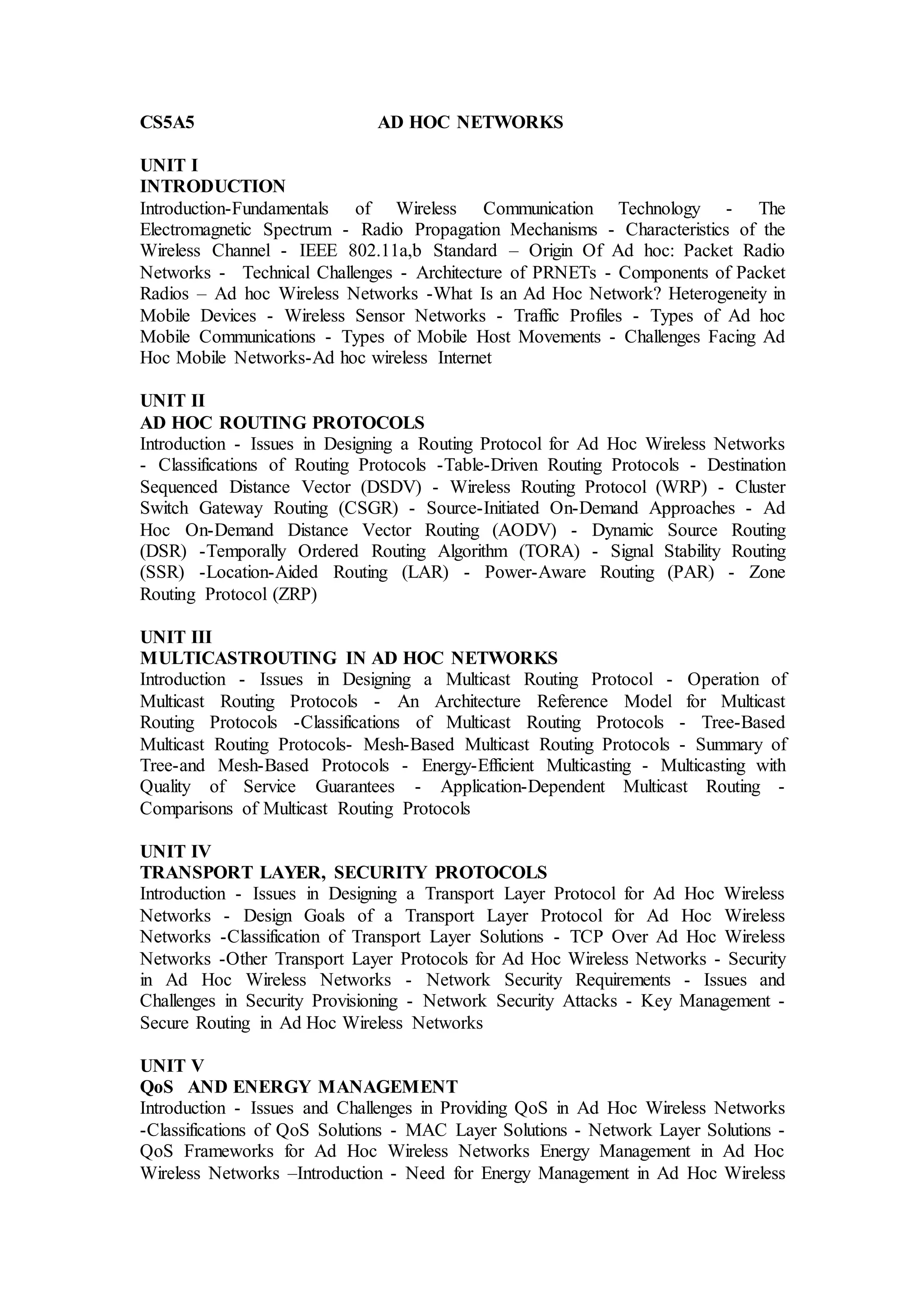 This document outlines the contents of a course on ad hoc networks. The course is divided into 5 units that cover: 1) fundamentals of wireless communication and ad hoc network introduction, 2) ad hoc routing protocols, 3) multicast routing in ad hoc networks, 4) transport layer and security protocols for ad hoc networks, and 5) quality of service and energy management in ad hoc networks. Each unit discusses key issues, classifications, and examples of protocols and solutions for the various aspects of building and managing ad hoc networks.