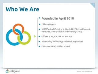 Integrate is an advertising technology and services provider founded in 2010 with 135 employees and $11M in funding. They launched AdHQ in 2013 to manage paid media campaigns through planning, execution, analysis and optimization across channels from a single dashboard using their comprehensive ad-serving technology and access to a network of over 3,500 vetted performance sellers. Their services provide simple, safe and smart advertising solutions through automation, fraud prevention and real-time marketing insights.