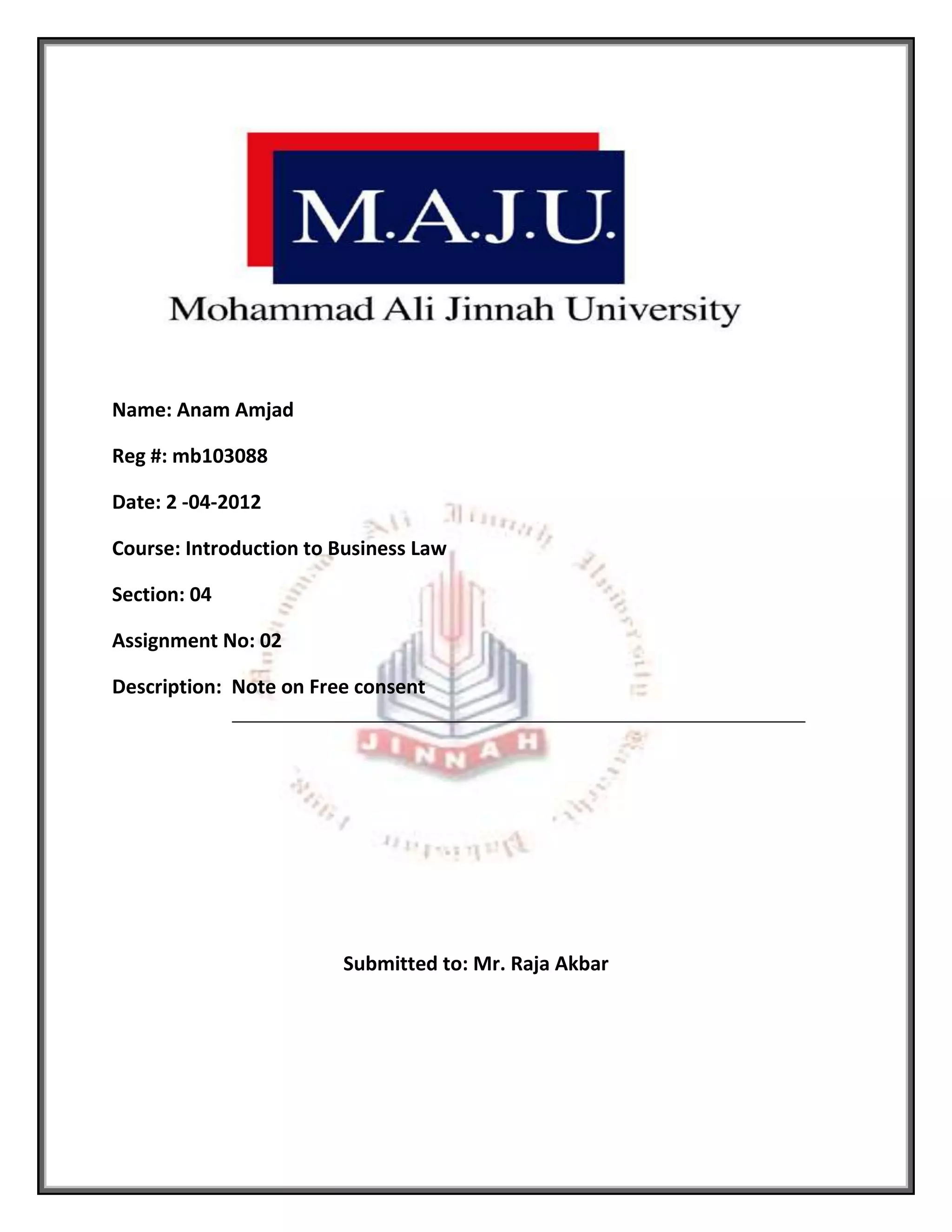 This document contains a student's assignment on the topic of free consent in contract law. It discusses key concepts such as ad idem, consent, free consent, coercion, undue influence, misrepresentation, fraud, and mistake. The assignment was submitted by Anam Amjad for their Introduction to Business Law course, along with their student registration number and the date and details of the assignment.