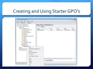 The document discusses creating starter GPOs in the GPMC and using them to create new GPOs. It also demonstrates inheritance blocking and GPO enforcement. Starter GPOs are created with enabled settings and used to quickly make new GPOs that inherit those settings. Inheritance blocking and enforcement are shown to override settings from parent GPOs.