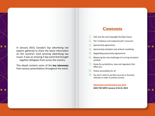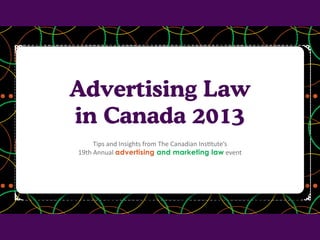 The document summarizes insights and key takeaways from the 19th annual Advertising and Marketing Law event in Canada, held in January 2013. It discusses important topics such as new copyright provisions for user-generated content, misleading advertising standards set by the Supreme Court, effective sponsorship agreements, and the importance of compliance with accessibility and privacy laws. Additionally, it highlights the significance of embedding privacy by design in business operations to foster consumer trust.