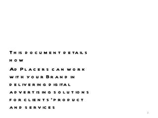 This document detailshow Ad Placers can work with your Brand in delivering digital advertising solutions for clients’ product and services