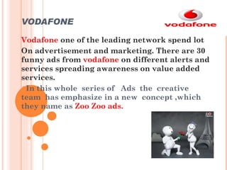 The document discusses Vodafone's advertising campaign featuring a new mascot, the Zoozoos. It introduced aliens as brand ambassadors to promote Vodafone's services in a humorous and entertaining way. The ads were very successful especially among youth and only cost around 3 crores to produce, less than animated ads. However, some found the ads unclear about what service was being advertised and the company name was only shown briefly at the end.