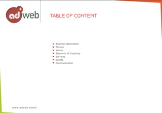 AdWeb is a digital marketing firm established in 2006 that provides various digital marketing services including strategic digital services, social media marketing, mobile marketing, email marketing, web solutions, and video marketing. It aims to help businesses and governments in India reach their marketing goals through innovative and creative solutions. Some of AdWeb's key services include social media management, email campaigns, mobile marketing tools, video creation, web design, and digital asset management systems. It serves clients across various industries in India from its headquarters in New Delhi.