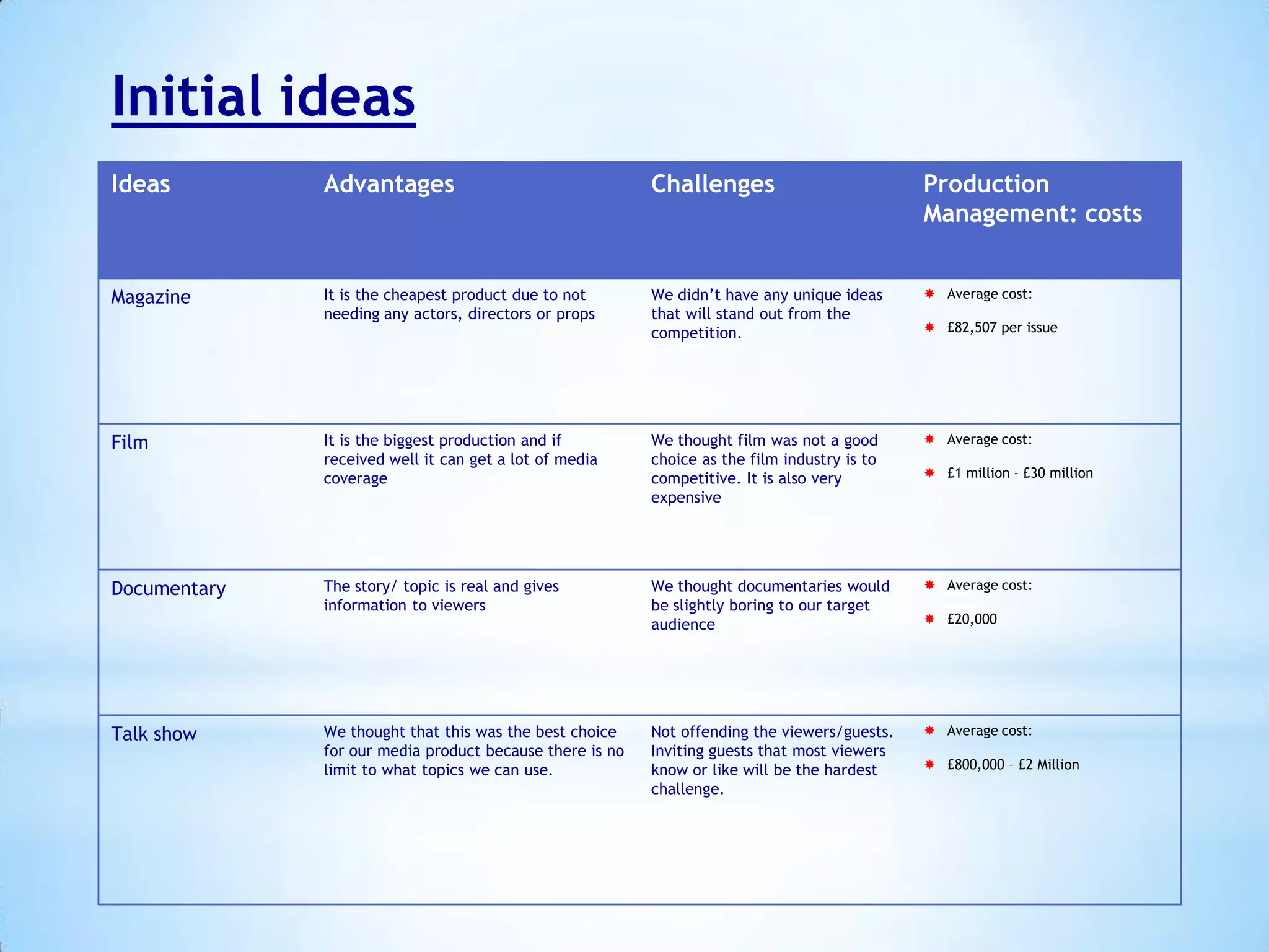 The group pitched their idea for a talk show called "After Dark". It would have a young presenter, Edward Ife, and feature celebrity guests like a basketball player and singer. They saw talk shows as having the lowest costs compared to other formats like film or documentaries. Challenges included finding guests that viewers would be interested in and not offending audiences. Their target audience was mainstream 18-35 year olds in London. They conducted research through questionnaires and examining competitors like Chatty Man. Storyboards, budgets, and risk assessments were created. Legal and ethical considerations around guests' privacy were also discussed.