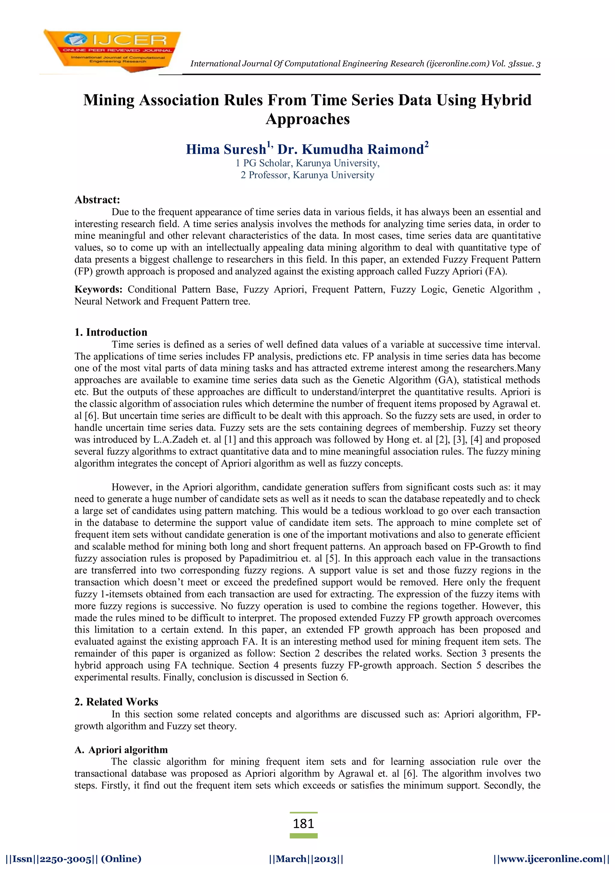 This document proposes and compares two hybrid approaches for mining association rules from time series data: Fuzzy Apriori (FA) and Fuzzy Frequent Pattern Growth (Fuzzy FP-Growth). FA transforms time series data into fuzzy sets, generates frequent itemsets using an Apriori-based approach, and extracts association rules. Fuzzy FP-Growth avoids candidate generation by constructing an FP-tree from the fuzzy itemsets and mining patterns directly from the tree. The approaches are evaluated on a home price time series dataset. Experimental results show that while FA can generate useful rules, it requires more effort due to costly candidate generation. Fuzzy FP-Growth aims to address this limitation through an efficient FP-tree based approach.
