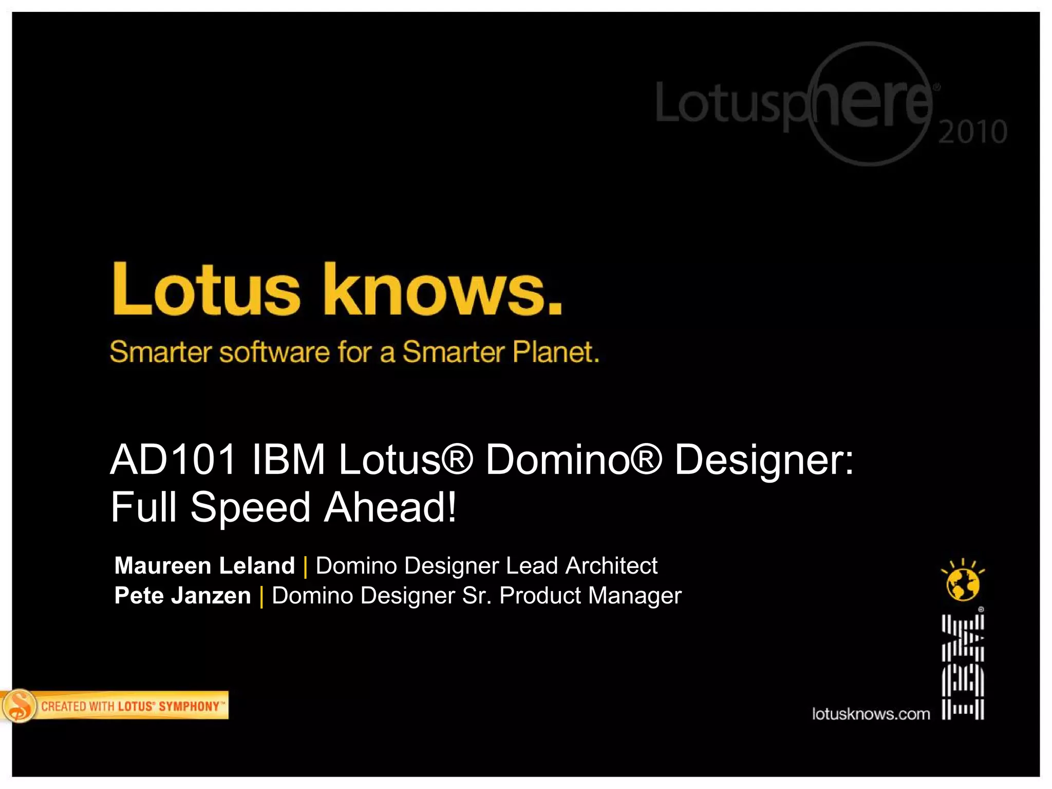 The document outlines updates and improvements in IBM Lotus Domino Designer 8.5.1, emphasizing enhanced performance, usability, and development tools for building web applications. Key features include a modern IDE based on Eclipse, improved code editors for LotusScript and Java, and continued support for XPages and integration with an open-source community. The document also addresses future directions like further enhancing ecosystem support, debugging capabilities, and source control integration.