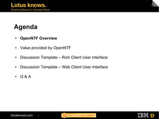 The document presents an overview of OpenNTF, emphasizing its role in fostering collaboration around IBM Lotus Notes and Domino applications as open source. It details the governance model, various assets, and contributions from the community, including numerous projects and templates available for educational and commercial use. Additionally, it discusses the enhancements made in the discussion template and encourages community involvement for continued success.