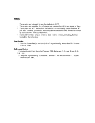 3. Important algorithm design techniques include brute force, divide and conquer, decrease and conquer, transform and conquer, dynamic programming, and greedy algorithms.