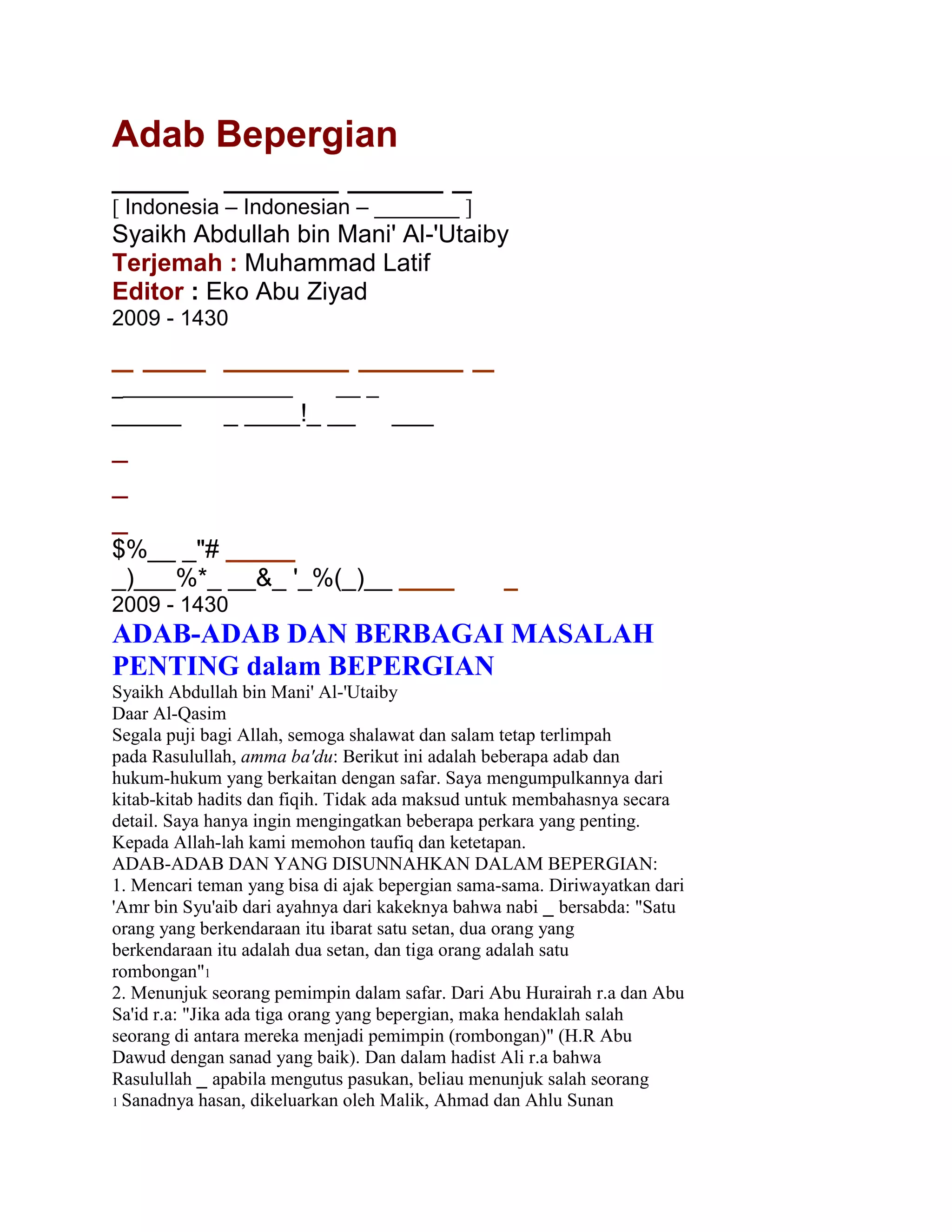Dokumen tersebut membahas adab dan hukum-hukum yang berkaitan dengan perjalanan (safar) berdasarkan kitab-kitab hadis dan fiqih. Beberapa poin penting yang disebutkan antara lain mengenai doa sebelum dan sesudah berangkat, menunjuk pemimpin rombongan, memperhalus bacaan shalat ketika dalam perjalanan, dan menjamak shalat apabila dibutuhkan.