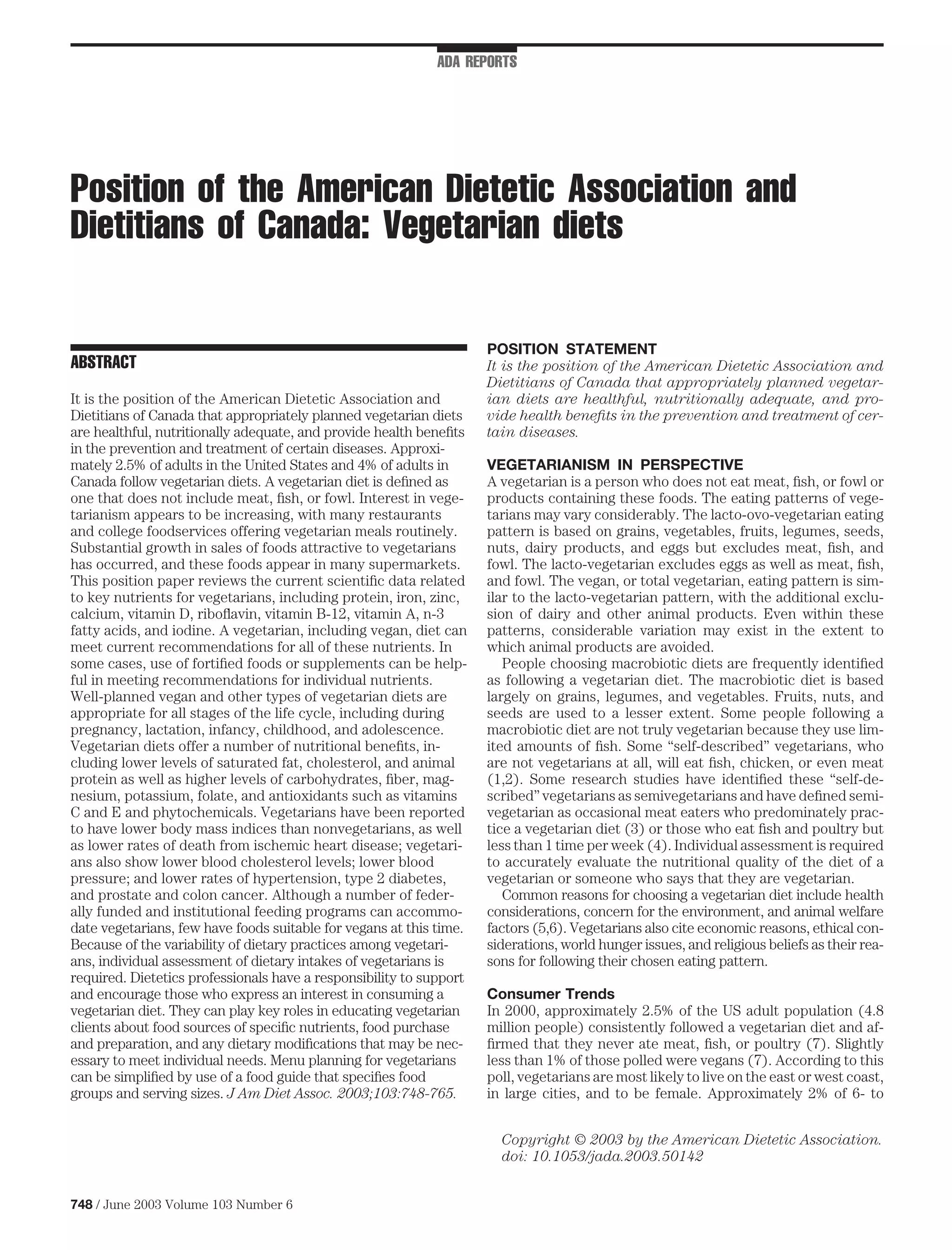 This document summarizes the position of the American Dietetic Association and Dietitians of Canada on vegetarian diets. It finds that appropriately planned vegetarian diets are healthful, nutritionally adequate, and provide health benefits. The document reviews considerations for key nutrients in vegetarian diets and finds that a vegetarian diet can meet recommendations for proteins, iron, zinc, calcium, vitamins B12 and D, and other nutrients when planned properly, potentially with fortified foods or supplements. Vegetarian diets may help reduce risk for heart disease, diabetes, and cancer when based on a variety of plant foods.
