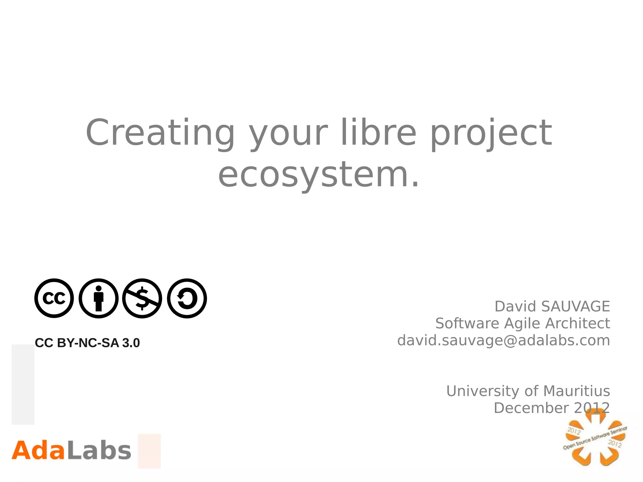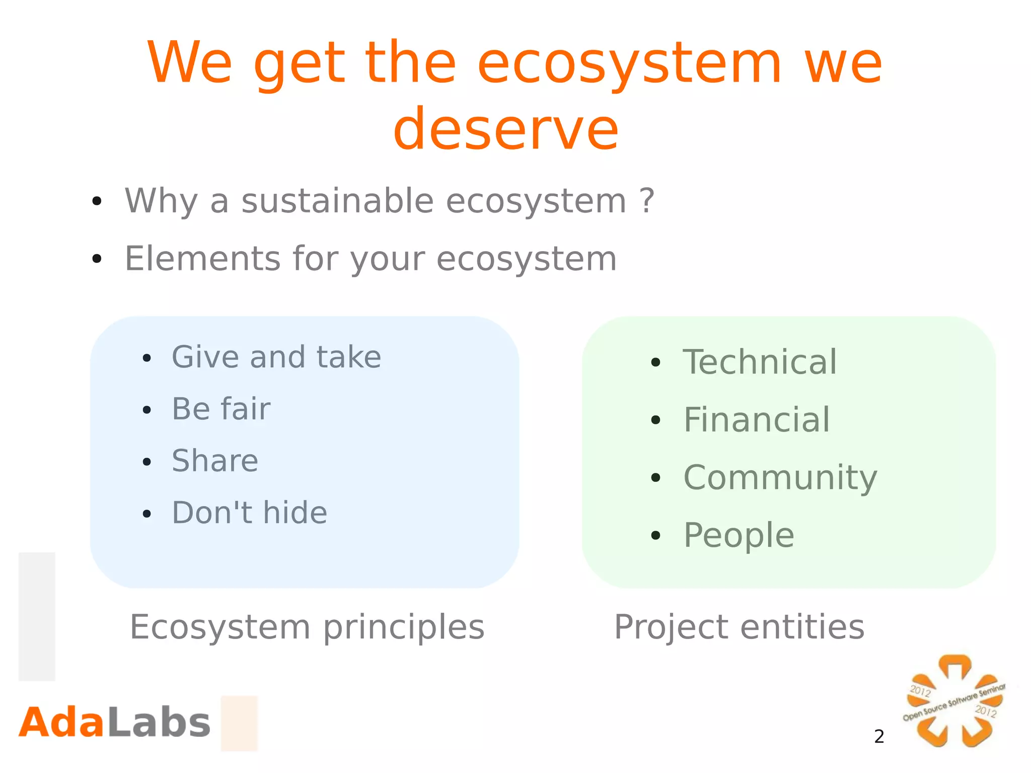 The document discusses principles for creating a sustainable open source software ecosystem. It outlines several key elements that are important for an ecosystem to thrive, including giving back to and sharing with the community through contributions, feedback, and issue reporting. It also emphasizes the importance of being fair and transparent to different types of users and contributors through accessible pricing and open access to source code and issue tracking systems. The overall message is that selfish or unfair practices will not support a long-term, profitable open ecosystem.