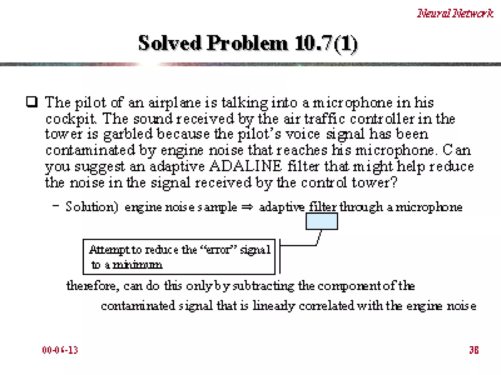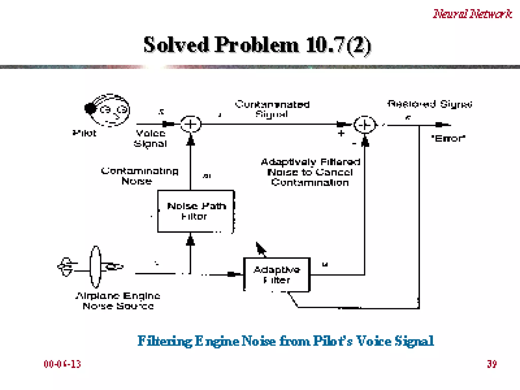 Summary Single layernets have limited representation power (linear separability problem) Adaline – Widrow-Hoff Learning D efi ne an error function that measure the performance of the performa n ce in terms of the weights, input, output and desired output. The ADALINE learning algorithm Adaptive filter: deals with the choppy issue, which mimics the leakage of the incoming voice for suppressing the choppy speech from the outgoing signals. Adaline has better convergence properties than Perceptron Useful in noise correction Adaline in every modem.