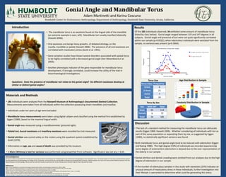 This study examined the relationship between gonial angle and the presence of mandibular tori in 185 individuals. It found a weak correlation between a smaller gonial angle and the presence of mandibular tori, though this correlation was not statistically significant. When edentulous individuals were removed from analysis, no correlation was observed. The gonial angle ranged from 110 to 147 degrees across all subjects, while 34 individuals exhibited mandibular tori ranging from less than 2mm to greater than 4mm in size.
