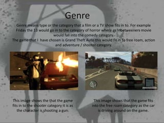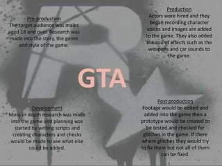 The document outlines the production process for a video game, including pre-production where research is done on the story, genre, and target audience, development where scripts and characters are created, and post-production where footage is edited and tested for bugs. It also discusses the genres, purposes, demographics, and psychographics related to the chosen game. Pre-production, development, and post-production are the key stages in the production of the video game.