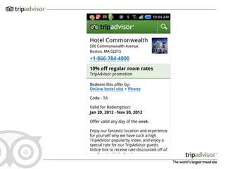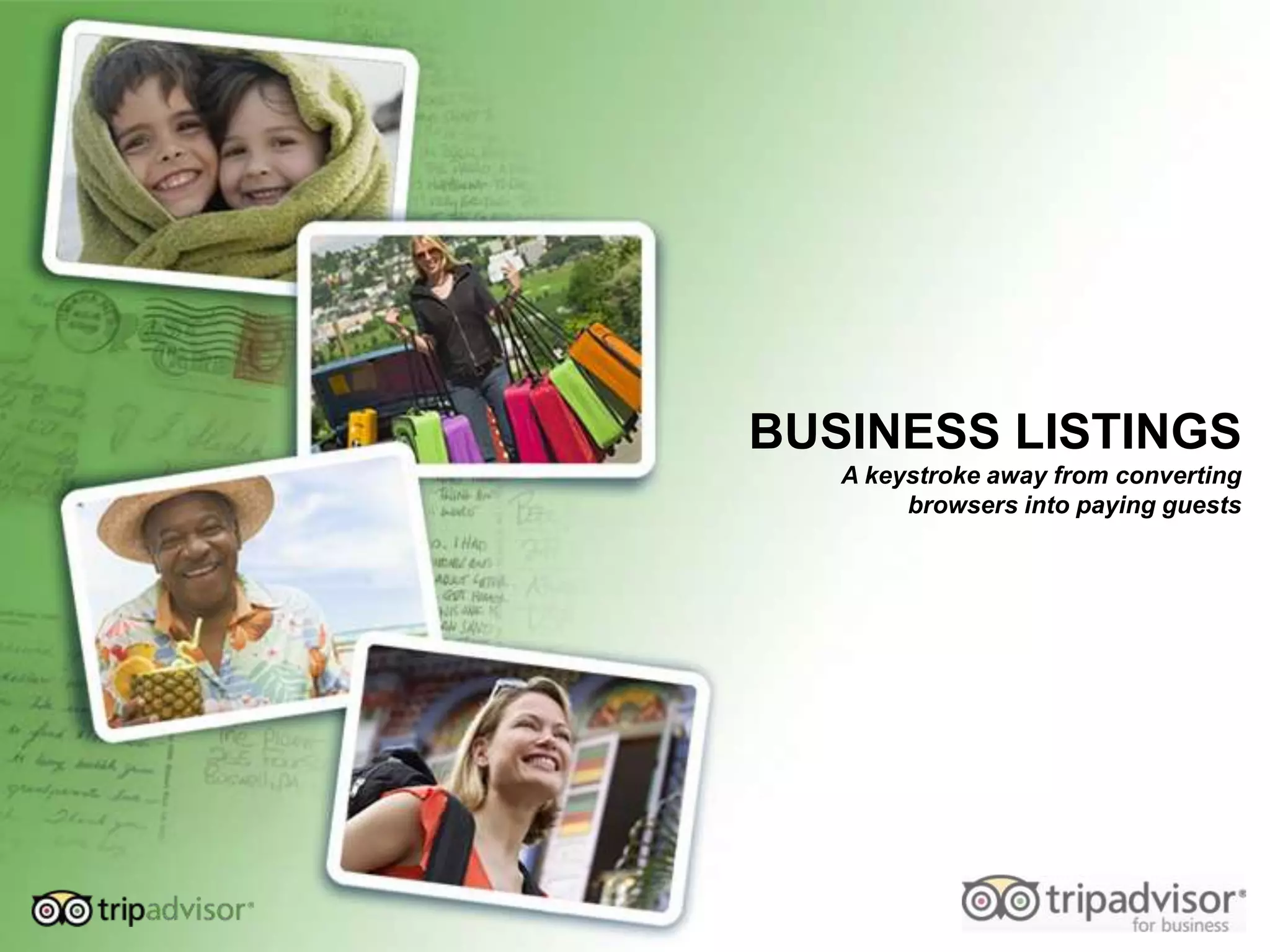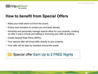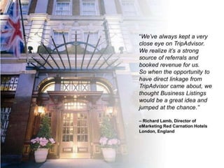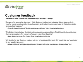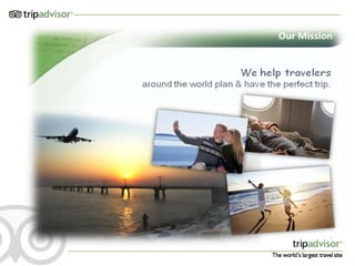 TripAdvisor is the world's largest travel website, with over 50 million unique monthly visitors. It provides thousands of unbiased reviews of hotels, restaurants, and attractions worldwide from over 1 million businesses. The document promotes TripAdvisor's business listing feature, which allows businesses to directly connect with TripAdvisor's large audience. It provides opportunities to offer special deals, respond to reviews, track performance, and showcase properties through photos and videos to convert browsers into paying guests.