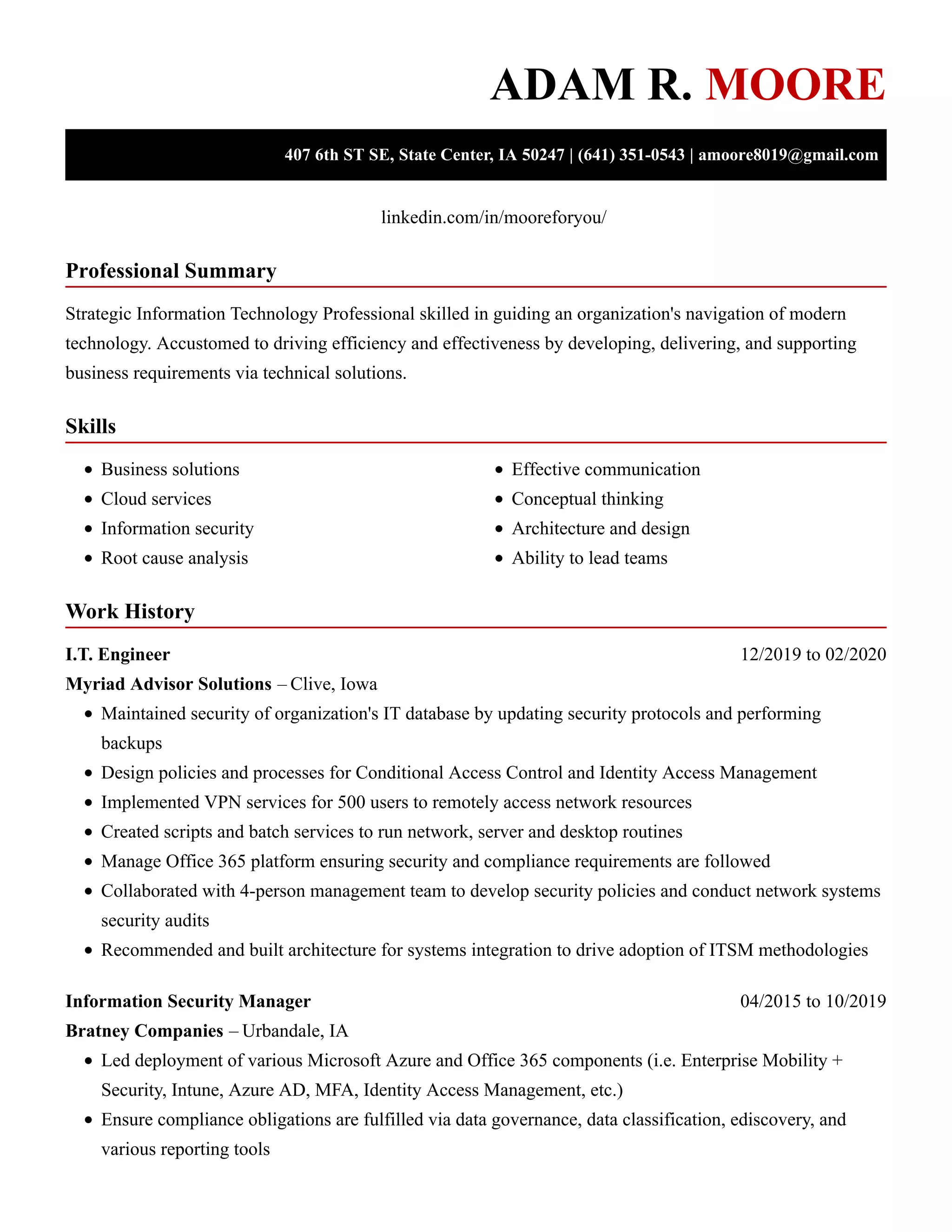 Adam R. Moore is an experienced information technology professional with a strong background in security management and cloud services, evidenced by his roles as an IT Engineer, Information Security Manager, and Director of Information Security. He has successfully implemented security protocols, managed team performance, and developed disaster recovery plans across various organizations. Moore holds a Bachelor's degree in Business Administration and has a proven track record of optimizing security and reducing IT expenditures.