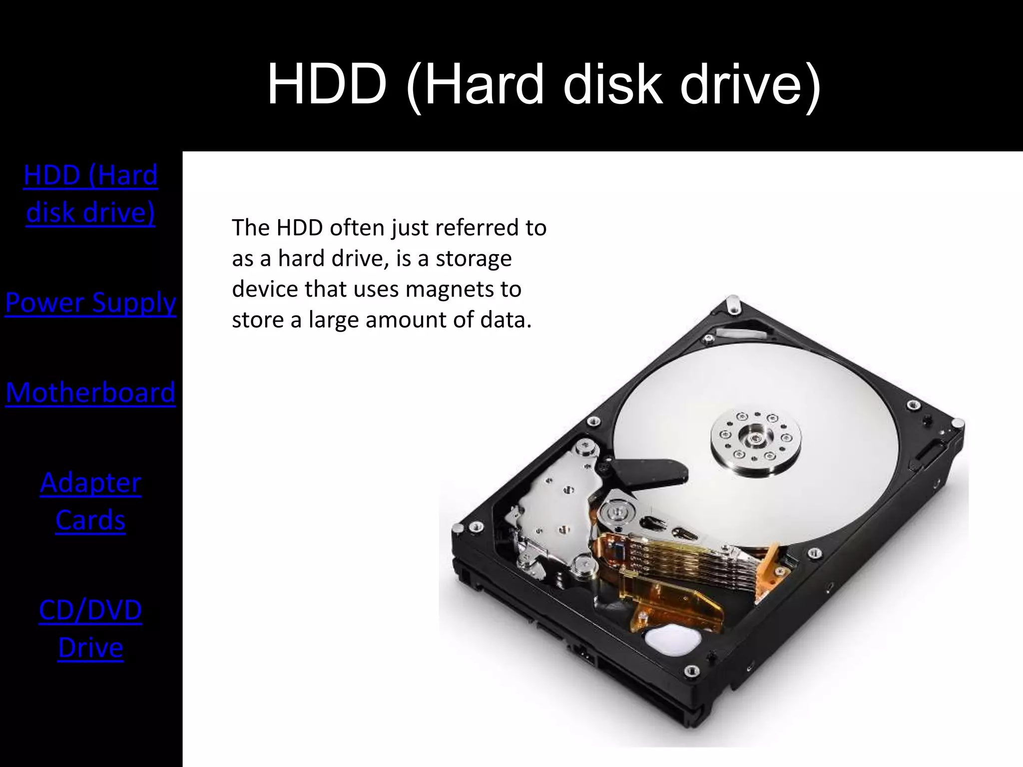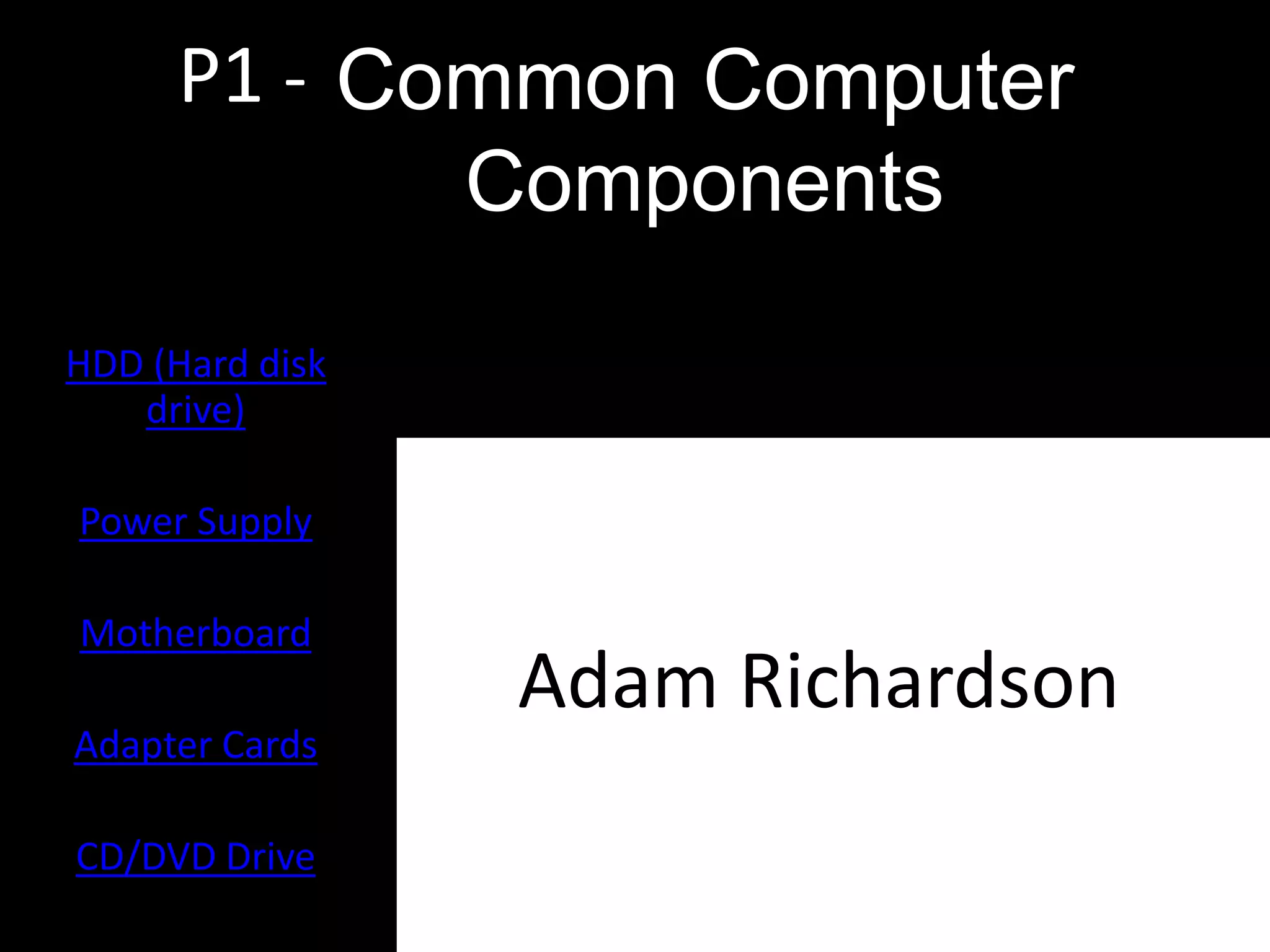 The document outlines common computer components including the hard disk drive (HDD), power supply, motherboard, adapter cards, and CD/DVD drive. The HDD serves as a magnetic storage device, while the power supply delivers voltage to the PC's circuits. The motherboard connects all components, and adapter cards enhance functionality for networking and display purposes.