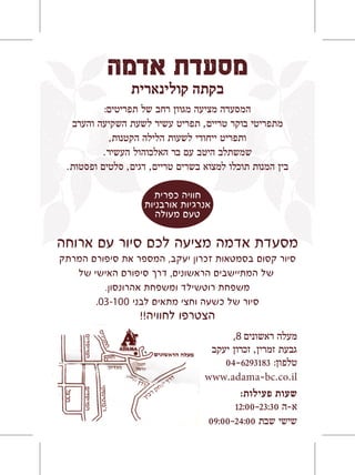 The Adama restaurant offers a culinary cabin experience with a magical walking tour through the narrow streets of Zichrn Yaakov ending with a meal. The tour lasts an hour and a half and tells the story of the town's first settlers through the personal stories of the Rothschild and Aronson families. The restaurant has a varied menu for lunch, sunset, and evenings, as well as drinks from its well-stocked bar, providing a pastoral atmosphere with urban energies and outstanding flavors.