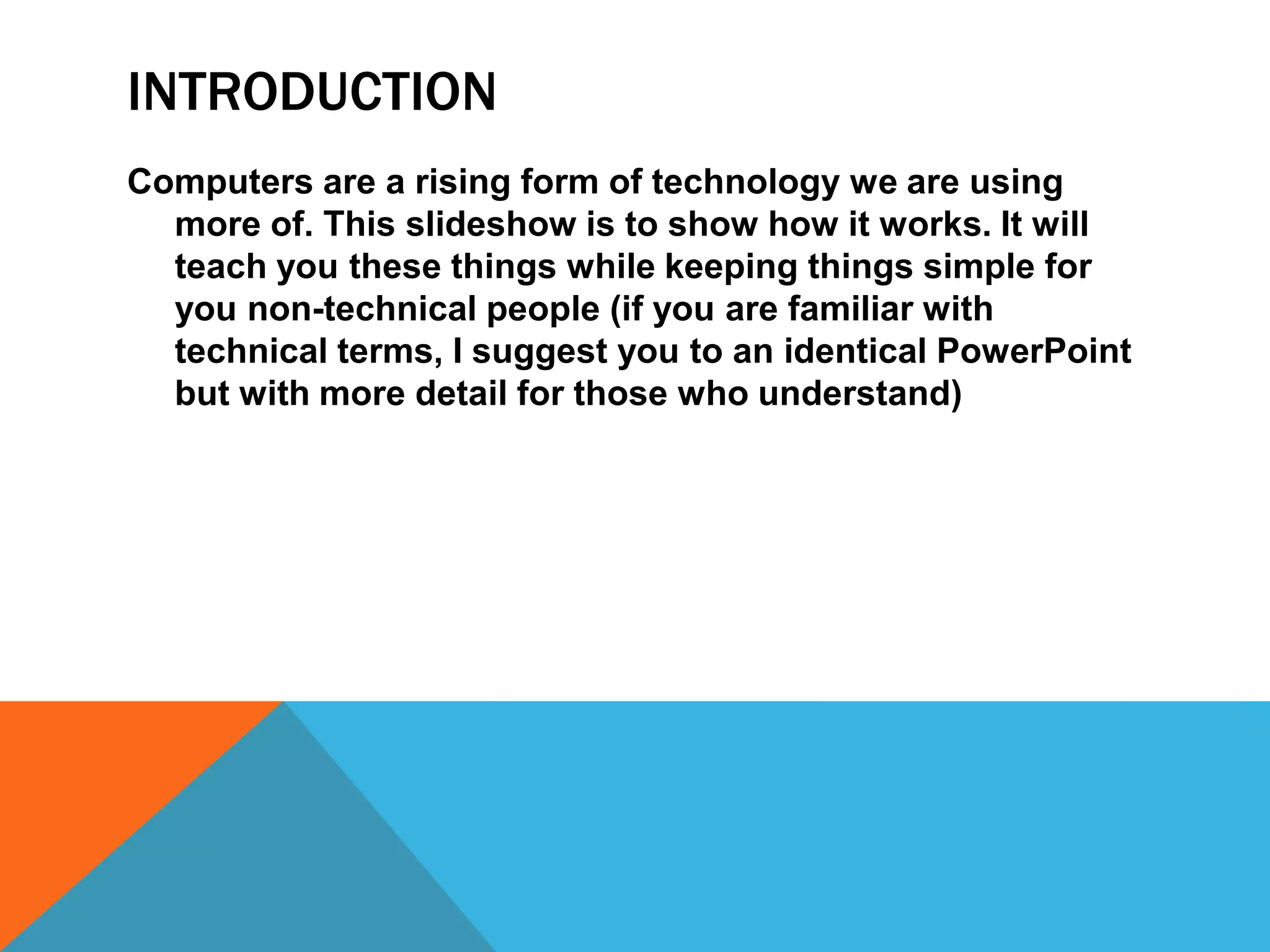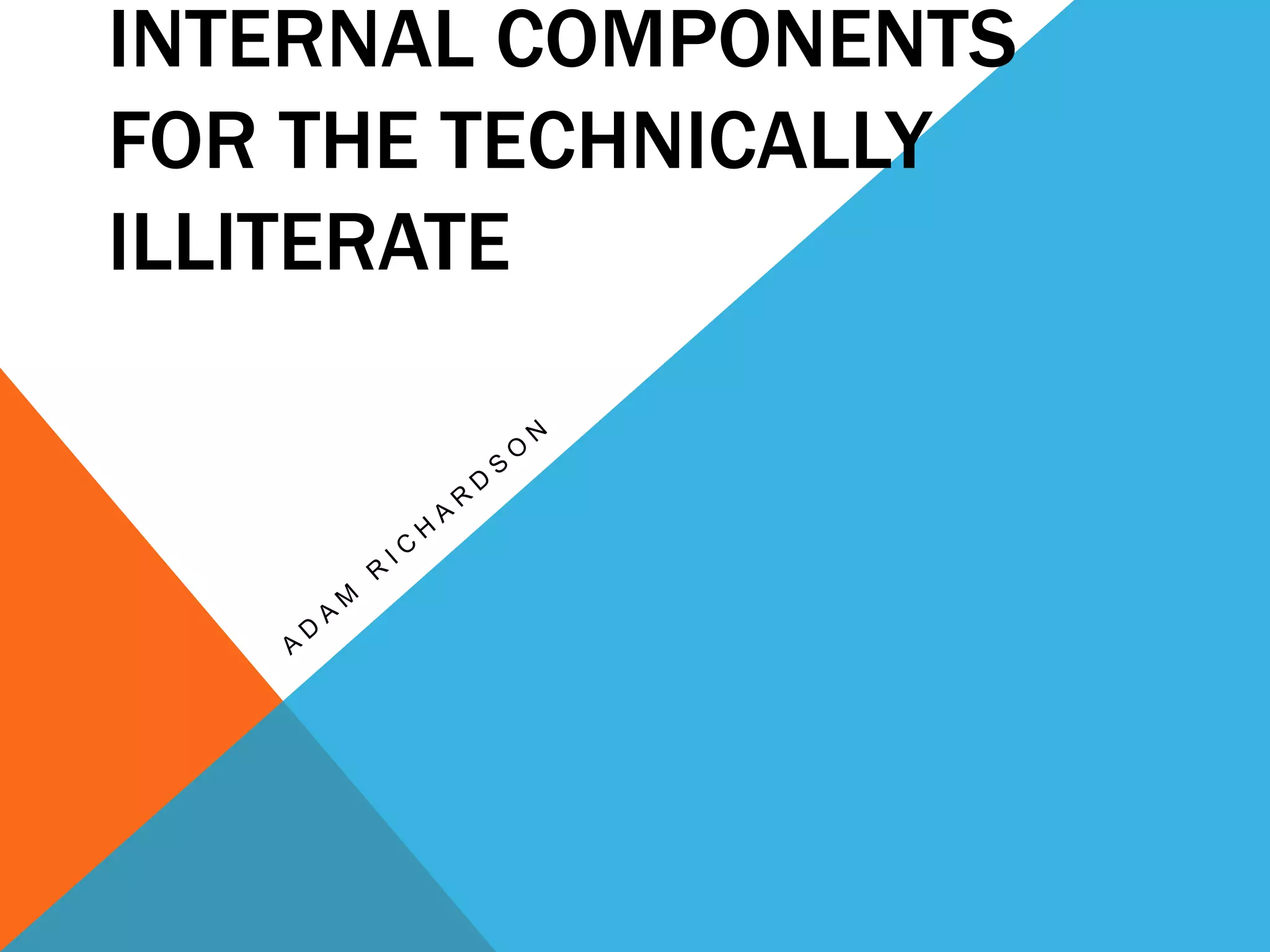 This document provides a basic overview of common internal computer components for non-technical readers. It explains what a CPU is and its function of processing information. It describes different types of memory including ROM, RAM, and flash memory. It also outlines common adapter cards like PCI and PCIe that connect computers to peripherals. Storage connectors like SATA and PATA are explained. Finally, it lists some common input devices like touchscreens, graphics tablets, and controllers and output devices like printers, monitors, and speakers.