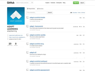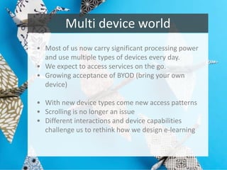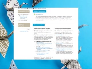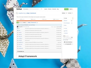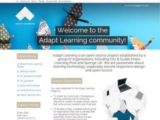The document discusses the evolution of responsive learning through the Adapt framework, which allows for a single course version to be accessed across multiple devices. Developed in HTML5, it emphasizes creating meaningful interactions and enhancing the user experience by considering device capabilities and navigation design. The document encourages engagement with the Adapt community and highlights the benefits of a responsive, adaptable approach in e-learning development.