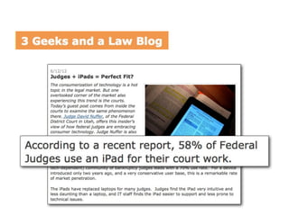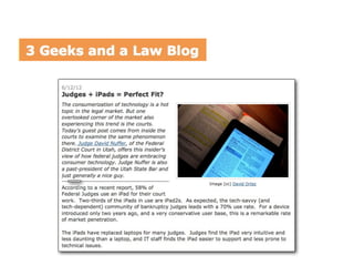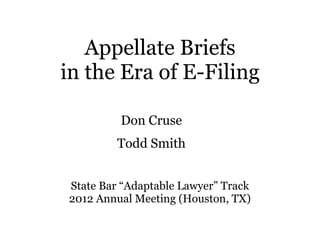The document discusses the impact of e-filing on appellate practice, including its requirements, benefits, and implementation in various courts in Texas. It highlights the importance of electronic briefs (e-briefs) in modern legal practice, emphasizing the need for compliance with court standards and the utilization of features like bookmarks and hyperlinks for better navigation and accessibility. Additionally, it addresses the technology used by judges and court staff, suggesting best practices for preparing and submitting electronic documents.