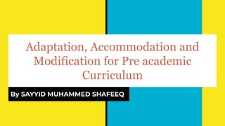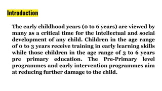 The document discusses the importance of early childhood education for children aged 0 to 6, particularly focusing on adaptations and modifications for children with intellectual disabilities (ID) in pre-academic curricula. It emphasizes the need for inclusive practices in preschool settings, highlighting the development of readiness skills through engagement in regular preschools. Key considerations for curriculum design include multisensory teaching, structured strategies, and a focus on functional activities that promote cognitive and social development.