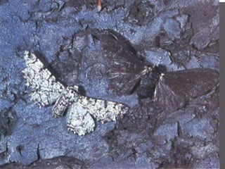 Animals develop physical features over many generations through natural selection that help them obtain food, stay safe from predators, build homes, withstand weather, and attract mates. These features are not acquired during an animal's lifetime but are inherited from parents and include traits like beak shape, number of fingers, fur color and thickness, and nose or ear shape. Many organisms avoid predators through camouflage, hiding, fleeing, or warning signals. The peppered moth example illustrates how a dark color mutation provided camouflage for moths in polluted areas, making the dark form more common than the light form.