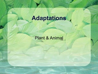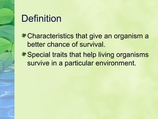 This document discusses adaptations that allow organisms to survive in their environments. It defines adaptations as characteristics that improve an organism's chance of survival. Adaptations can be structural, like body size or shape; behavioral, such as being nocturnal; or physiological, like hibernation. Examples are given of structural adaptations like sharp teeth in carnivores or thick fur in arctic foxes that protect against cold. Behavioral adaptations include animals moving in groups for protection. Physiological adaptations include ways organisms regulate internal functions. Specific habitat adaptations are described for kangaroos, orcas, tigers, orangutans, cacti, and aquatic plants.