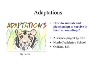 This presentation discusses the adaptations of various animals and plants that help them survive in their environments. It describes how dolphins are streamlined and have excellent hearing, how crabs have a hard shell and pincers to protect themselves and catch prey, and how sparrow hawks have excellent eyesight and claws to hunt. It also summarizes adaptations of eagles, sharks, penguins, chameleons, polar bears, camels, and moles.