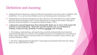 Adapted physical education is physical education designed for students with disabilities. It aims to develop motor skills, physical fitness, and responsible behavior through physical activities tailored to students' needs and abilities. The history of adapted physical education involved excluding students with disabilities from physical education until laws like the IDEA mandated their inclusion and access to adapted physical programs. Physical education teachers now play an important role in implementing individualized instruction, including students in general programs when possible, and addressing the diverse needs of students with various disabilities through adapted physical education.