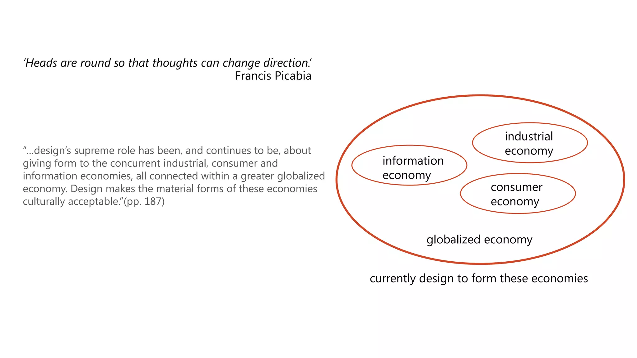 1) The document discusses how design has traditionally focused on giving form to industrial, consumer, and information economies within a globalized system, but that a new vision is needed where design takes a more activist role on behalf of society and the environment.