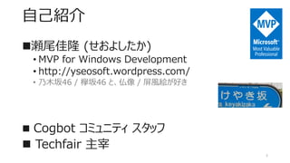 for Windows Development • http://yseosoft.wordpress.com/ • 乃木坂46 / 欅坂46 と、仏像 / 屏風絵が好き Cogbot コミュニティ スタッフ Techfair 主宰 2