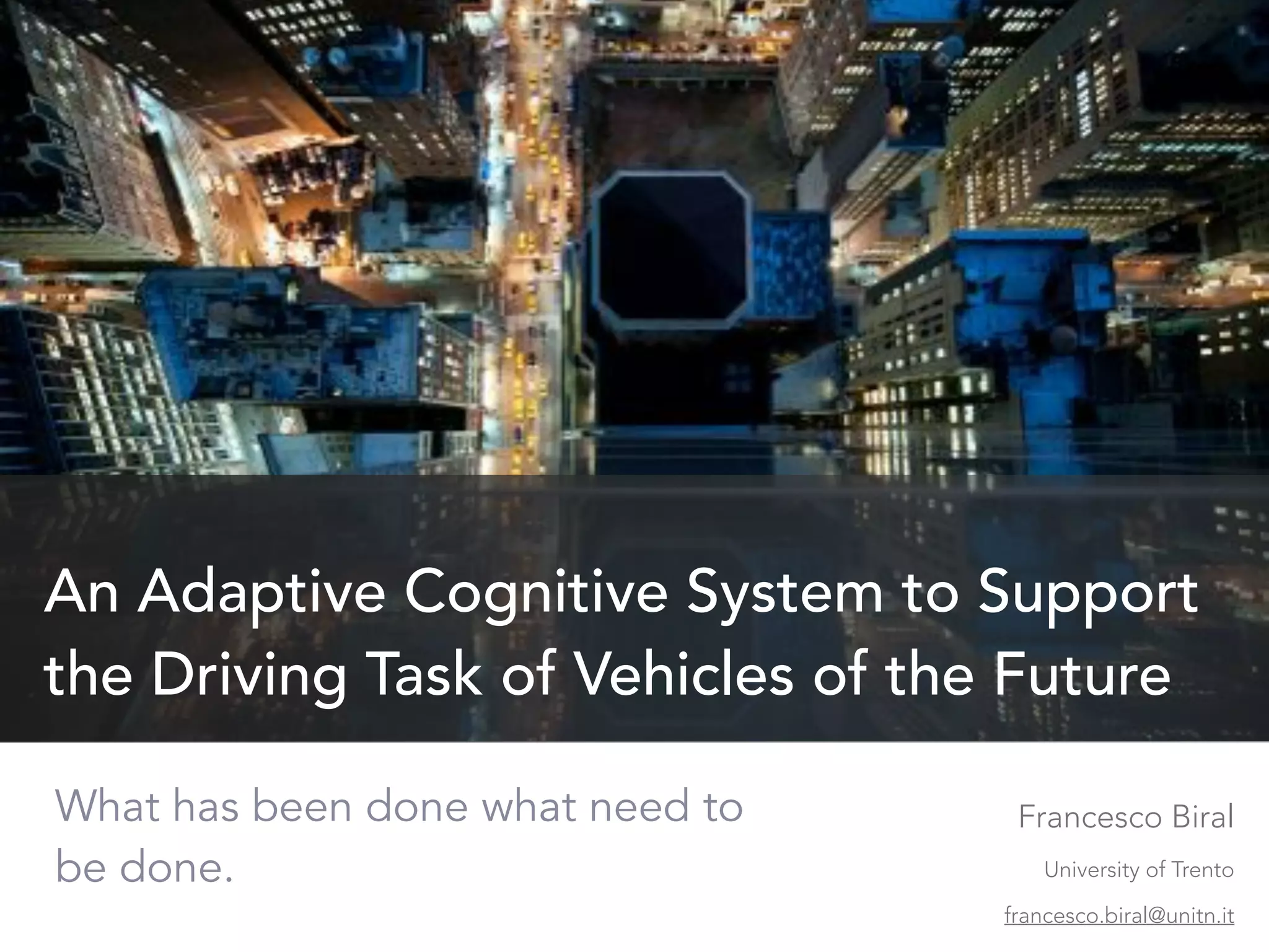 The document presents an adaptive cognitive system designed to enhance the driving tasks of future vehicles through a co-driver model that understands human driver intentions and actions. It emphasizes the importance of driver cooperation and the need for the co-driver to emulate human-like sensory-motor behaviors to ensure efficient vehicle control. Key technologies discussed include simulation theories of cognition, generative approaches for agent behavior, and a hierarchical behavioral model inspired by human motor control.